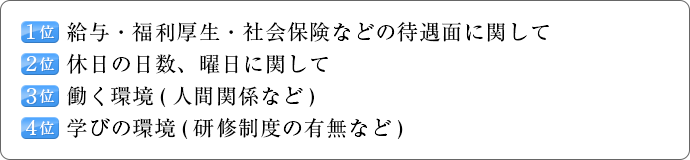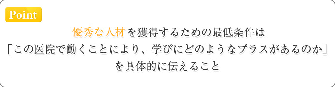 弊社の調査でも、医院側から「優秀」と判断されたスタッフほど、金銭的な待遇面よりも、「この医院で働くことで何が学べるのか」「研修制度の有無」「セミナー参加補助の有無」を重要視する傾向がありました。つまり裏を返せば、金銭的な待遇面や休日に関して特徴がなくとも、この部分を手厚くすることで優秀な人材を獲得できるということです。