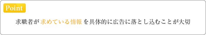 上記を見ると「やはり給与などの待遇面が良くないと集まらないのか・・・」と思われるかもしれませんがそれは違います。たとえ地域相場より待遇面が悪くても、働く環境や、研修制度が整っていれば採用することはできます。ここではわかりやすく順位を付けましたが、あまり気にされなくても問題ありません。理解していただきたいことは、上記4つが求職者の求める情報であることを念頭に置いて求人広告を作成するということです。この情報を知っているか否かで広告の表現方法もガラリと変わってきますので。