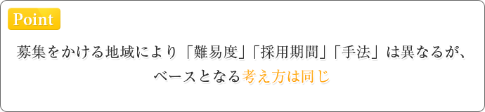 しかし、立地により「難易度」や「採用までの期間」「手法」が変わります。